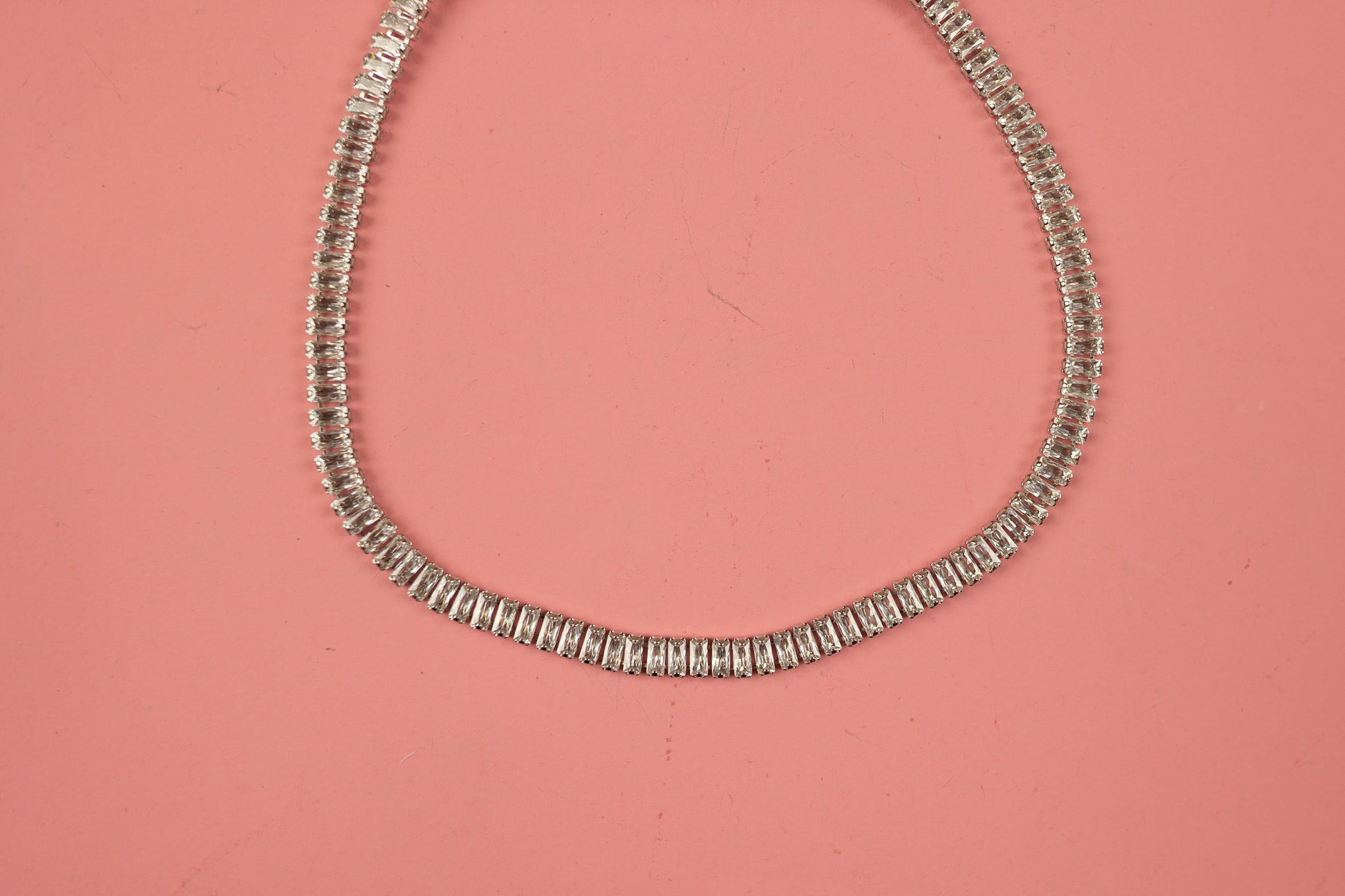 We love the vibe of a choker. A little edgy a little different a Baguette cut stone choker necklace.