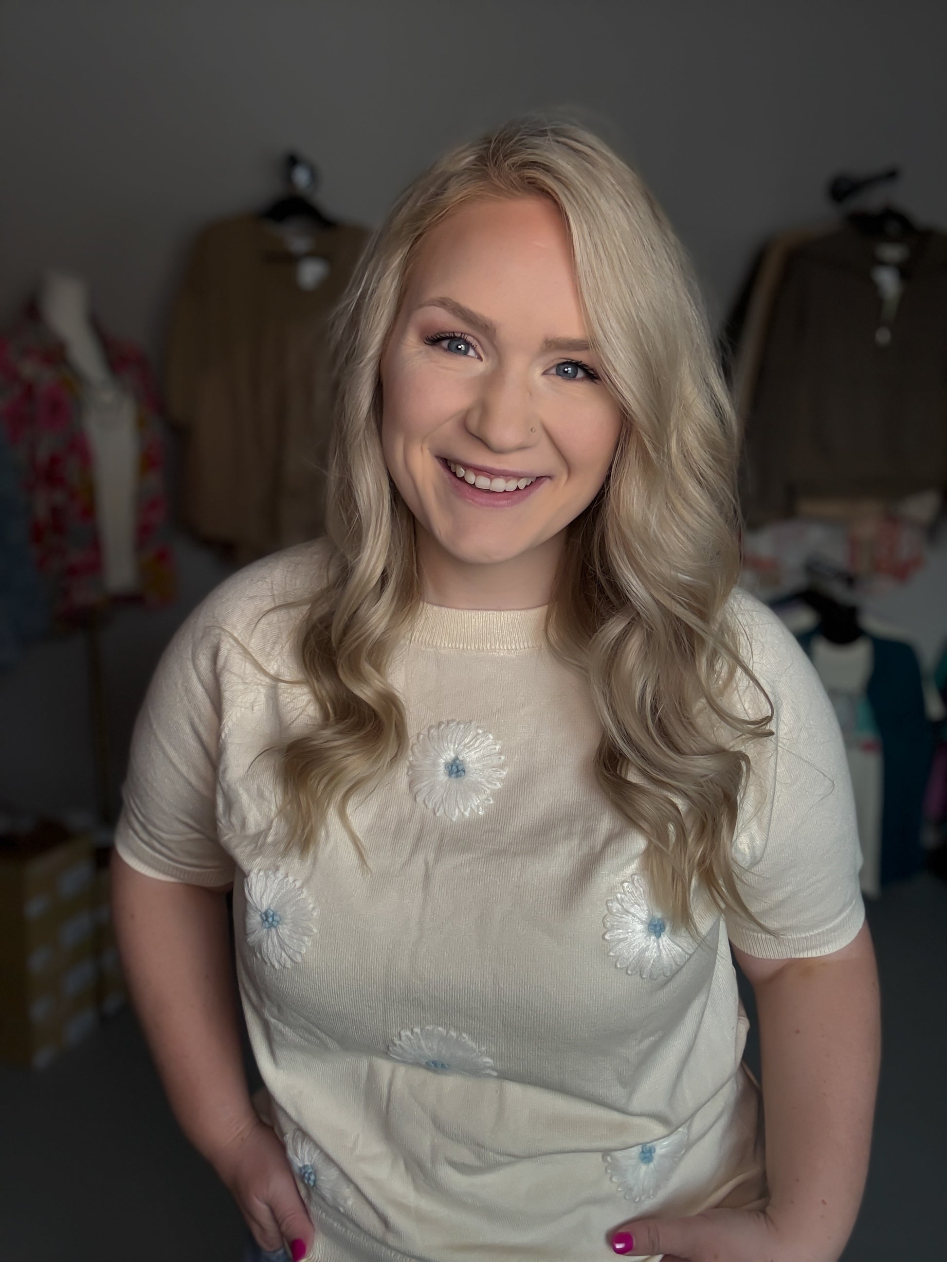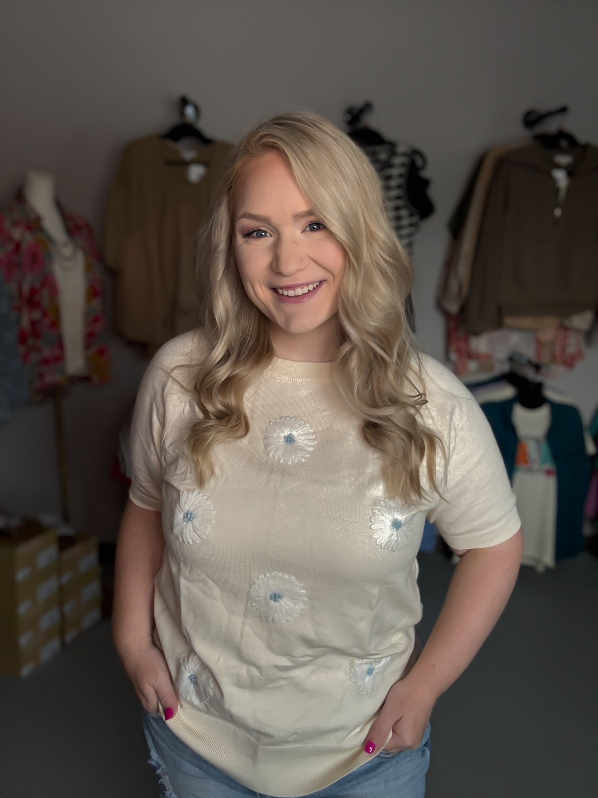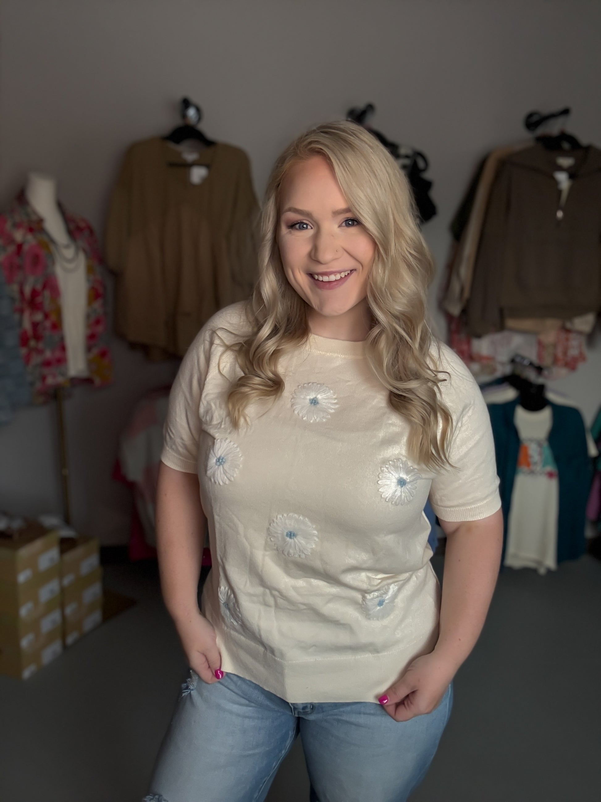 Bloom with style in the Flower Knit Top. This beautifully crafted top features a delicate floral knit design that adds texture and a touch of whimsy to your wardrobe. Soft, lightweight, and perfect for layering or wearing solo, it brings a cheerful vibe and a feminine flair to any outfit.