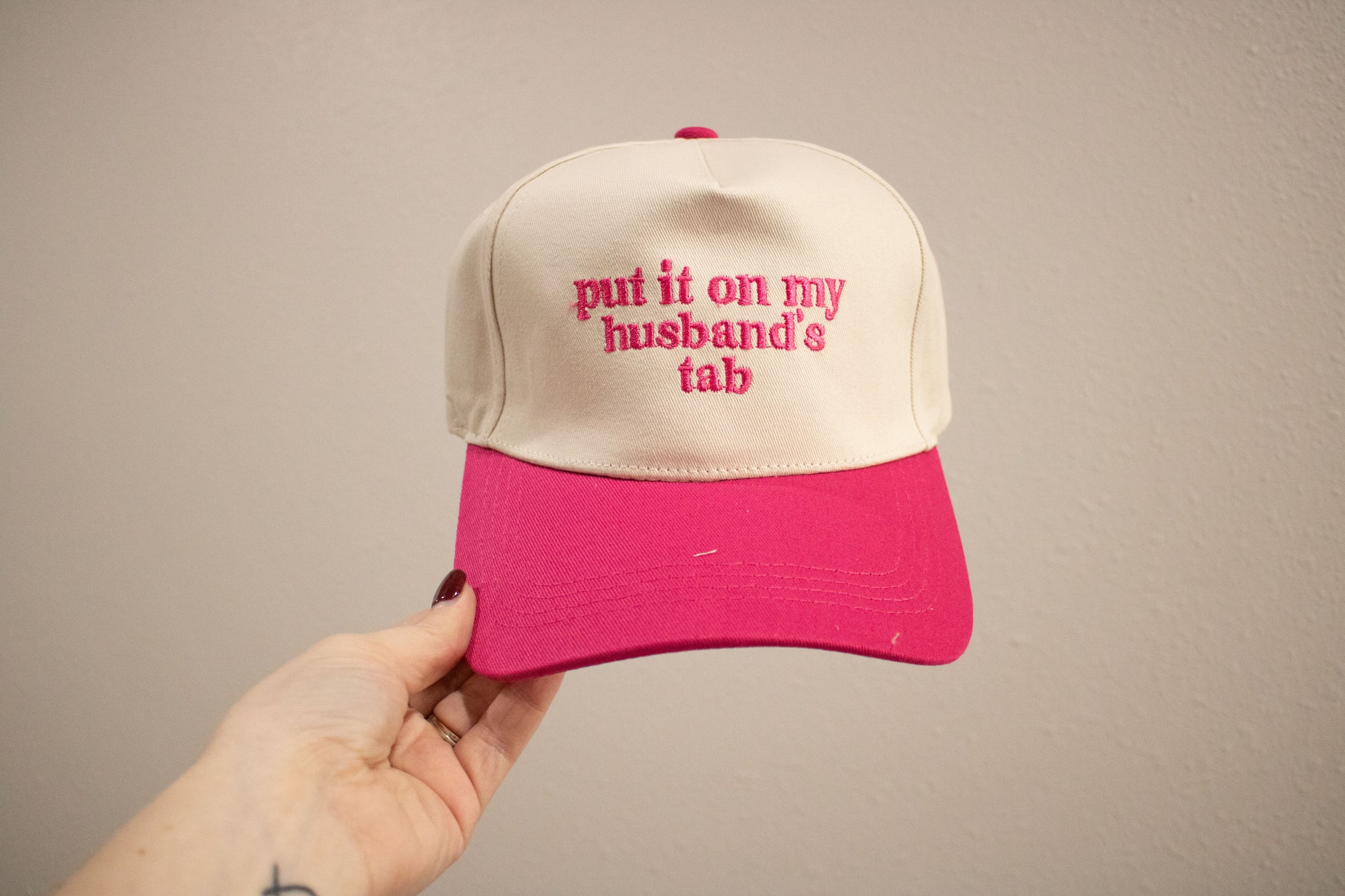 Add a playful twist to your everyday look with this embroidered “Put It On My Husband’s Tab” hat. Available in multiple color combinations, this hat brings attitude and style to casual days, bachelorette parties, girls' nights out, or just a fun weekend vibe.